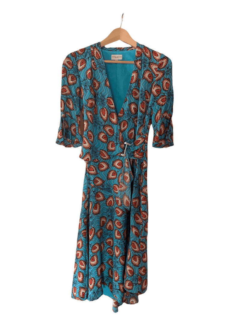 Stunning Karen Miller Silk Blue Wrap Style Dress with Gorgeous Print in Orange. Silver Belt. UK Size 10. EU 38. Excellent Condition.