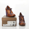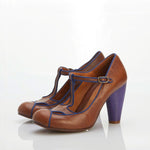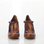 Chie Mihara Leather Tan & Blue Mary Jane Style Shoe UK Size 6. Striking shoe, main body is tan leather with feature blue edging to T bar and edges of cut out pattern on shoe. Heel is 4 inches and is the same blue as the edging. Very stylish, excellent condition.