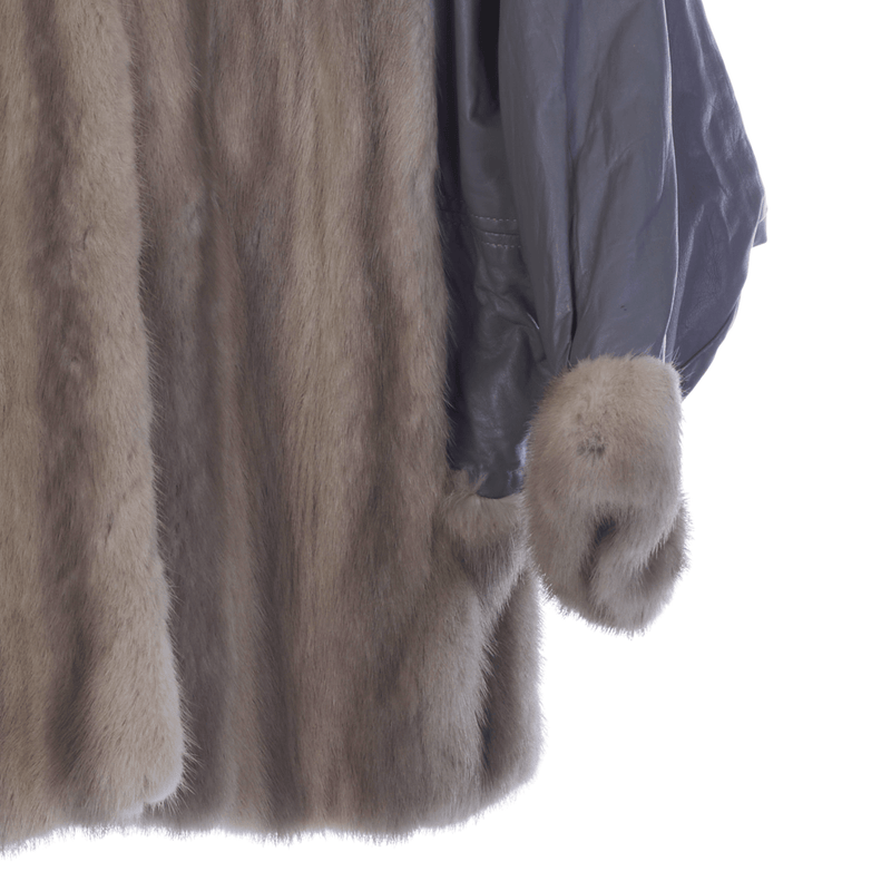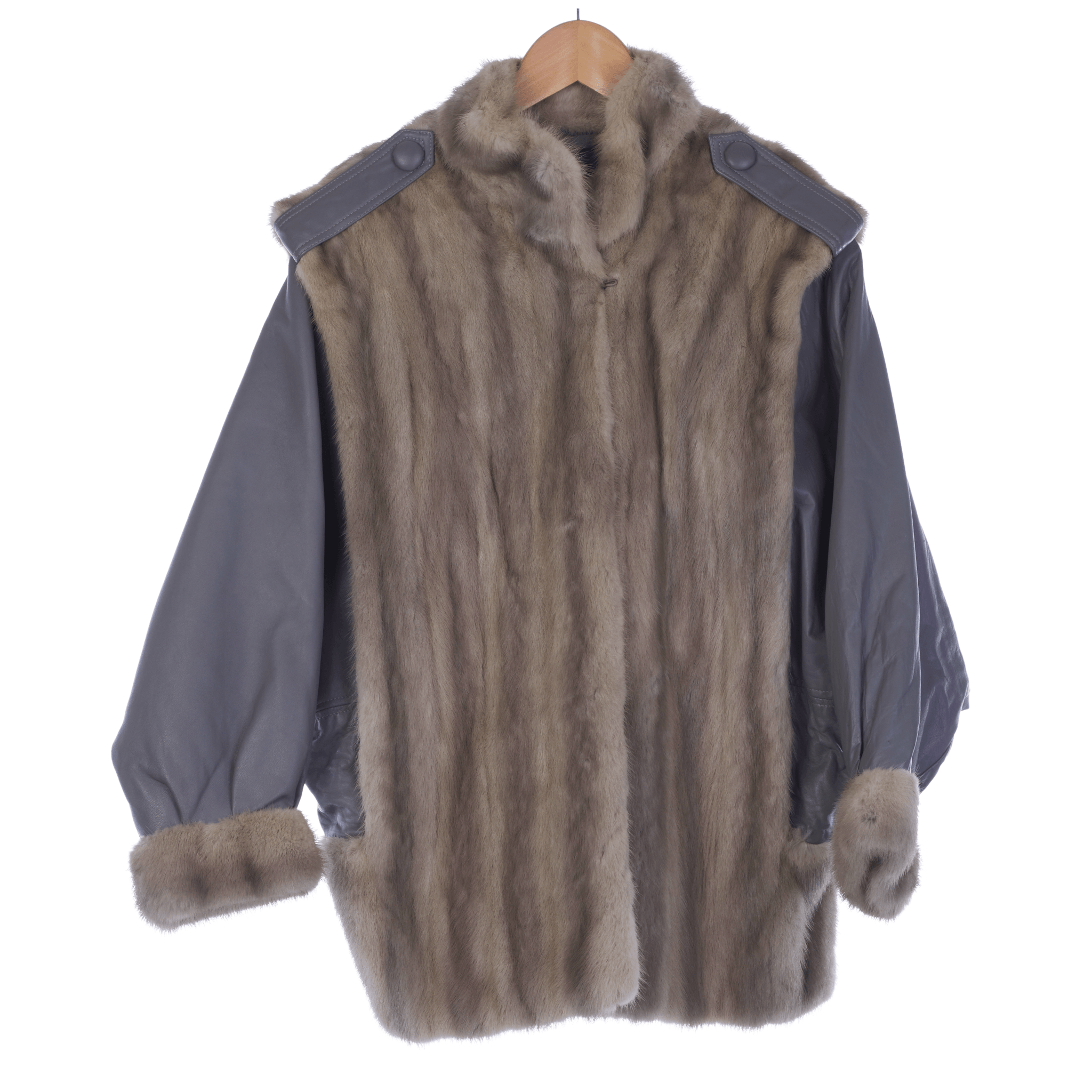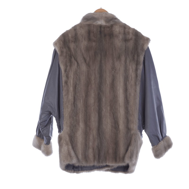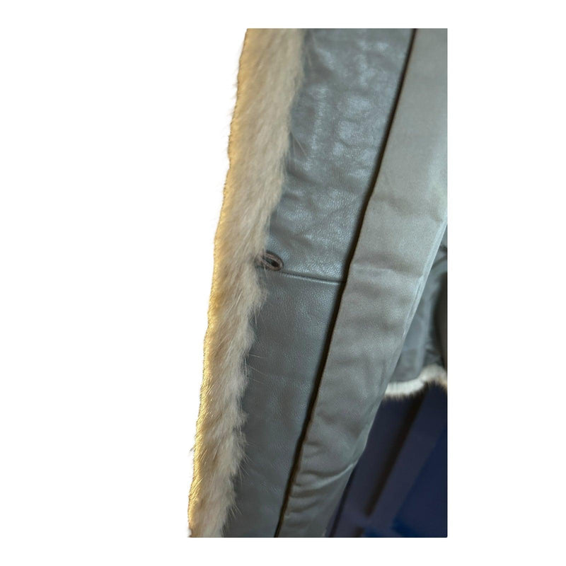 Vintage Leather and Faux Fur Long Sleeved Grey Bomber Style Jacket UK Size 10. Unique collarless, bat winged fully lined bomber style jacket. Fastenings are hook and eye, fur is on main body and cuffs, leather is arms and epaulettes. Measurements are chest 35" which is a UK size 10. Excellent condition.