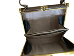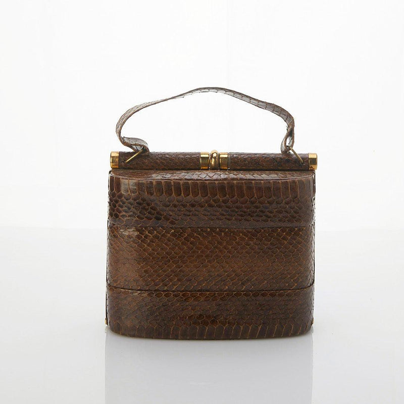 Vintage Leather Brown Snakeskin Handbag. Stunning camera style fixed body bag with single carry strap. Open with a purse style catch, when open it is fully lined and extends, central storage for small items and a separate material purse and small mirror.