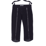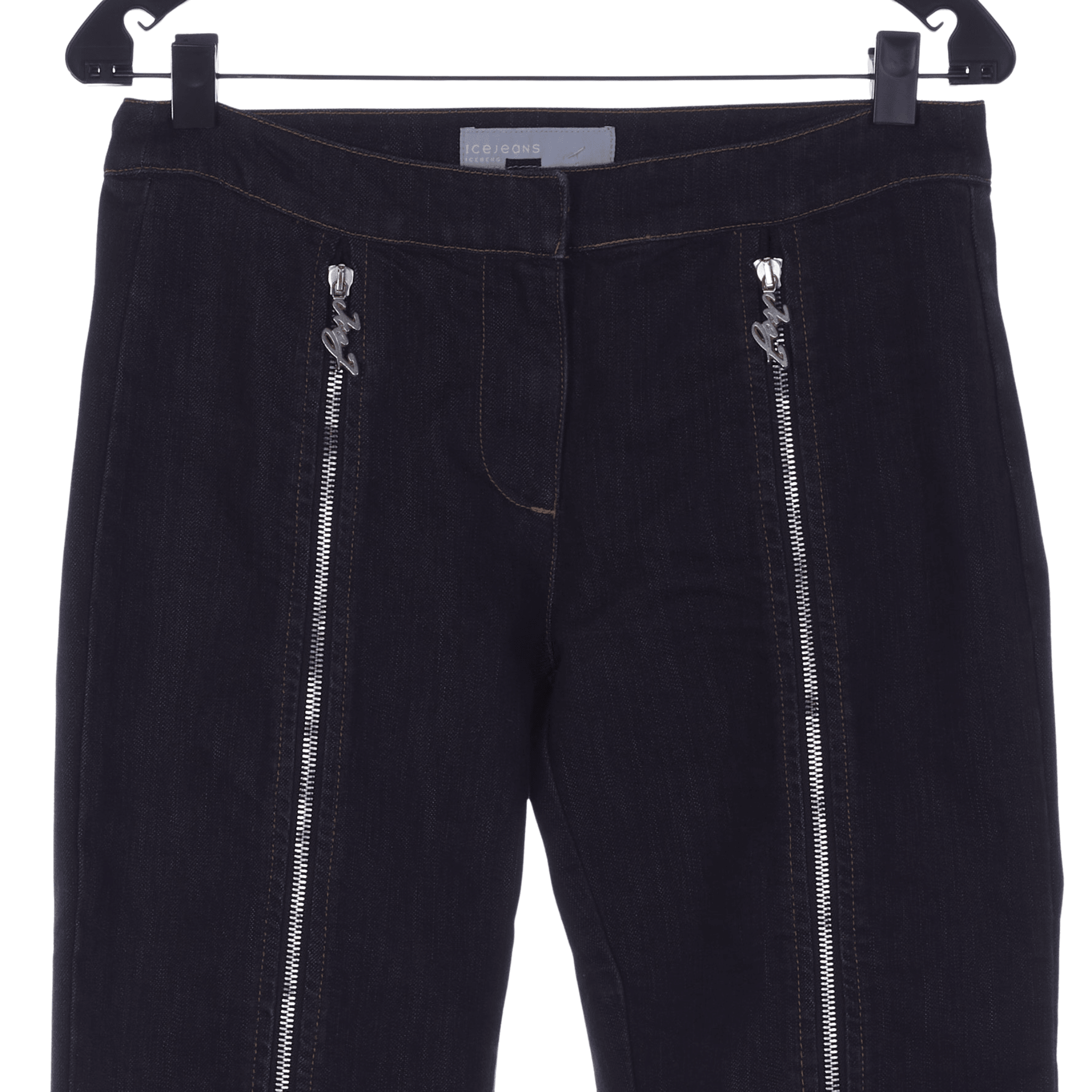 Icejeans Denim Black Peddle Pusher Style Cropped Trousers UK Size 10. Italian made black demin peddle pushers with feature zips to front. Zips have a monogrammed attachment top and bottom 'icej' and open to reveal a mesh interior. This mesh is replicated on the back pockets which have a stud fastening. They are an Italian 42 which is a UK size 10. Excellent condition.