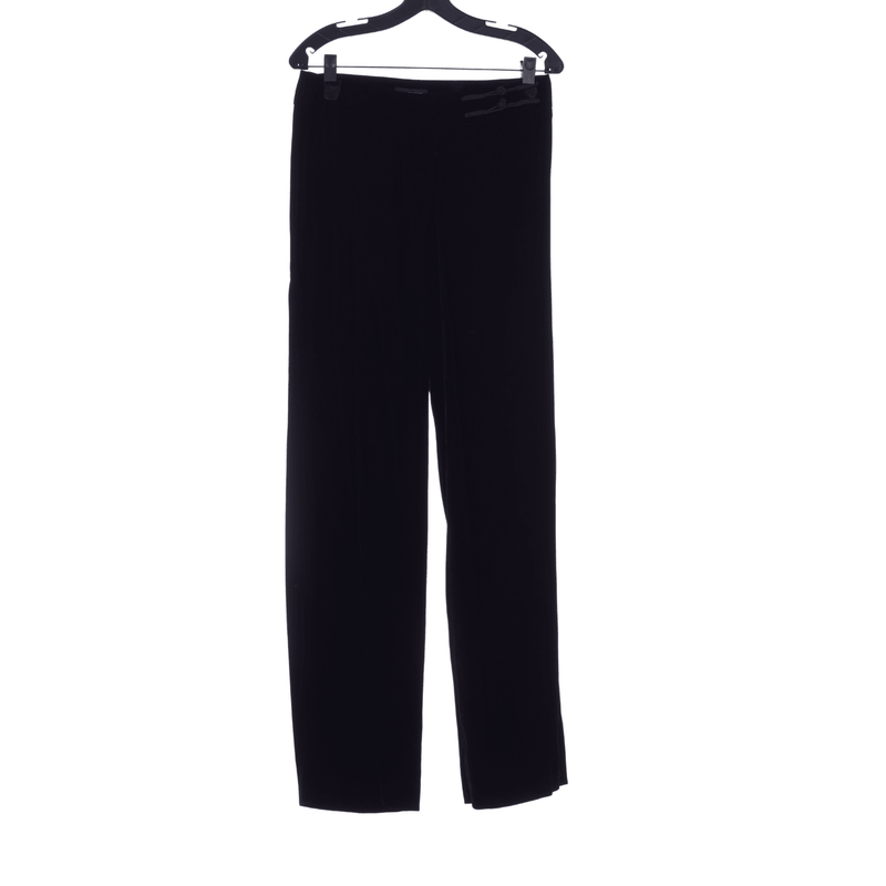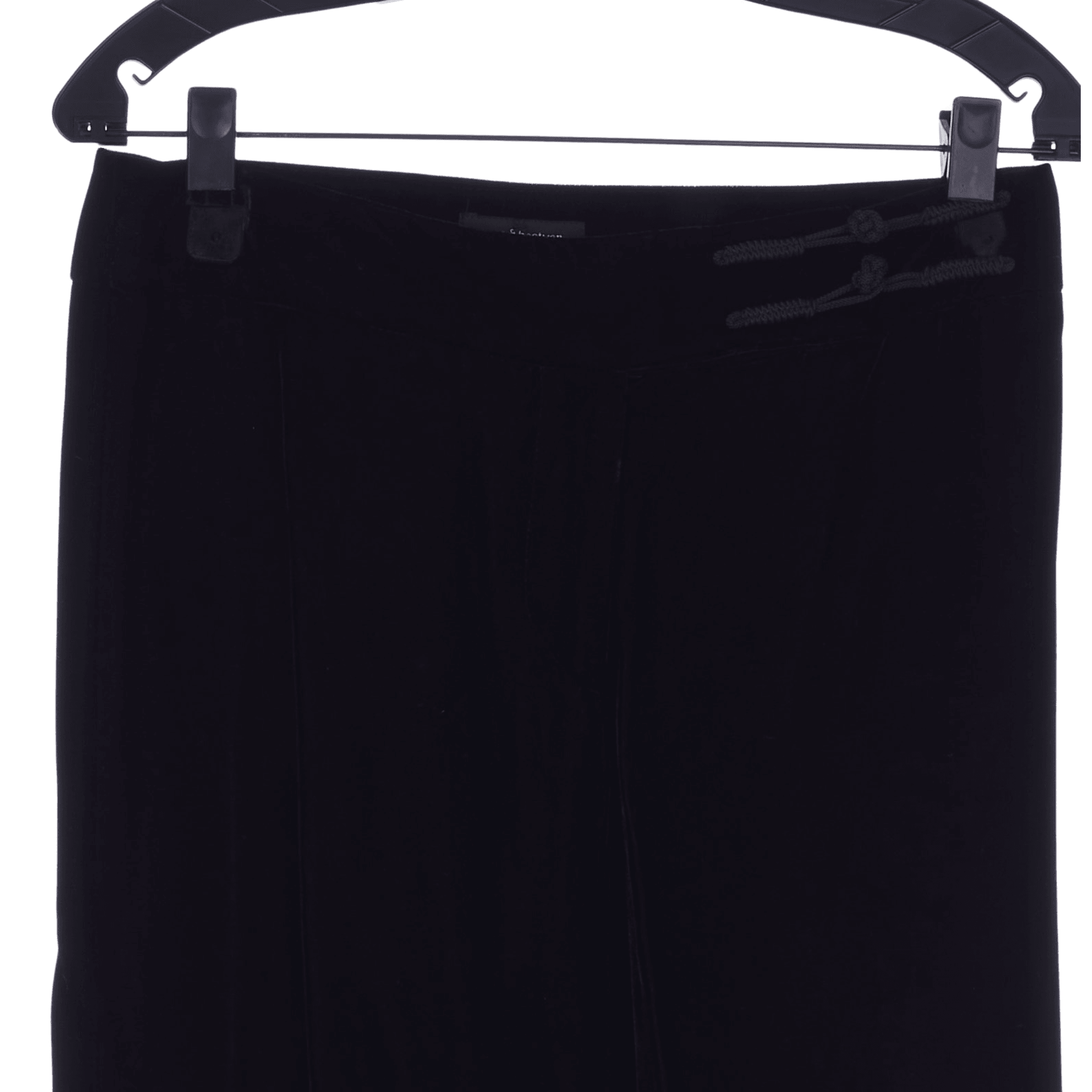 Press & Bastyan Black Wide Leg Trousers UK Size 10. Stunning velour feel trousers with feature fastening to side of waistband. This is braided black rope style and adds a sophisticated feel. Material is viscose, has a luxury look and feel. Excellent condition.