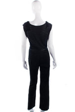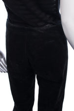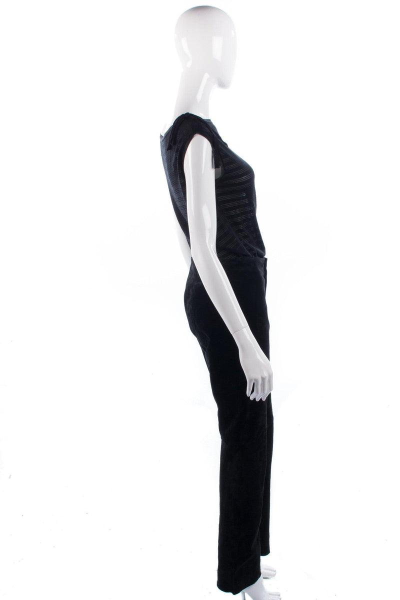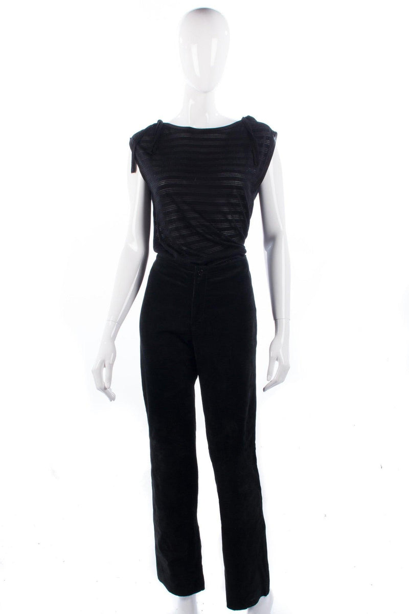 Lovely front zip and fastening. Suede black trousers, straight leg and can be cut to your own length. Size S, label say size 4, measurements suggest a UK8? please check the measurements suit you before buying
