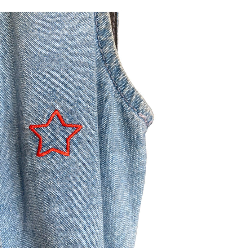 Preen Line Cotton Denim Sleeveless Dress Uk Size Extra Small. Lovely soft denim dress, button fronted, fitted to waist with full skirt. Feature Embroidery to collar and chest, hidden pockets, excellent condition.