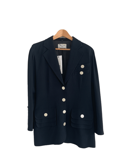 Wonderful fine wool viscose mix Burberry double breasted navy jacket . A real classic which would look good with tailored trousers or skirt and equally good with jeans . Could be worn oversized too. Two front pockets and wonderful gold buttons with the horse Burberry logo embossed, fully lined. Very good condition