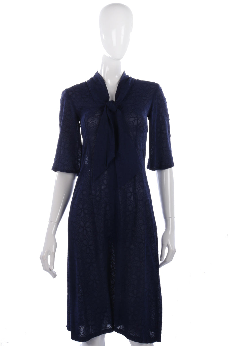 Amazing dark blue floral embroidered dress with neck tie. The dress is sheer, therefore it would be best worn with a slip underneath. A lovely dress for many occasions.