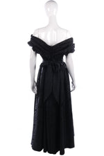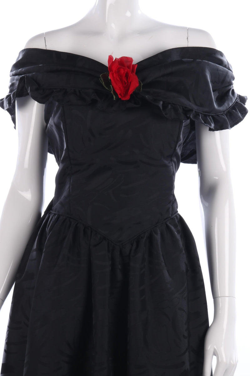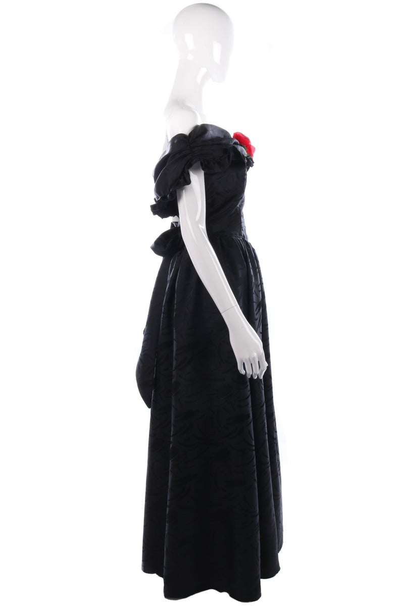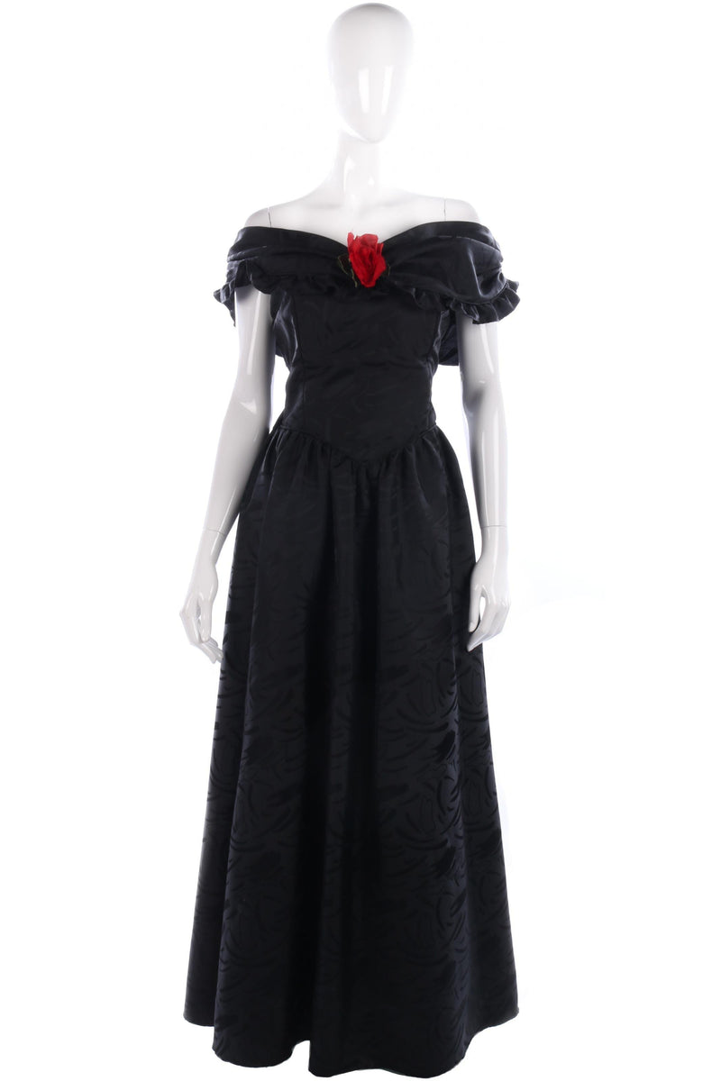 A truly classic black, off shoulder ball gown with red rose detail. The fabric has a subtle pattern, and lovely tailoring around the waist and shoulders.