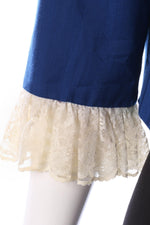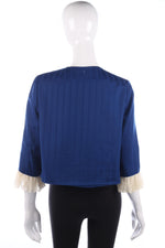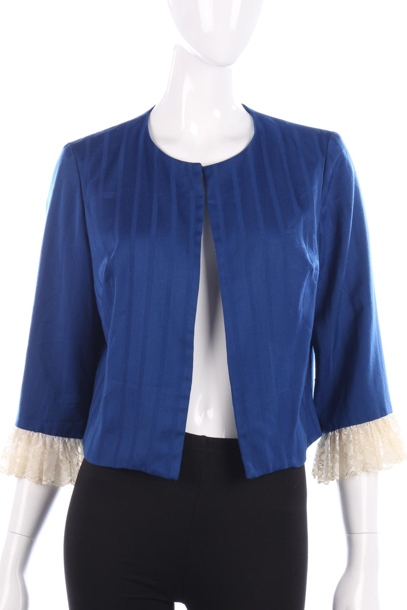 Stunning blue cropped vintage jacket with lace trim on the sleeves. Hook and eye fastening at the top near the collar. Fully Lined. No size or fabric label but we estimate this to be modern size 8/10