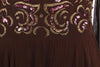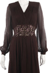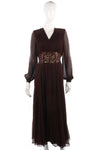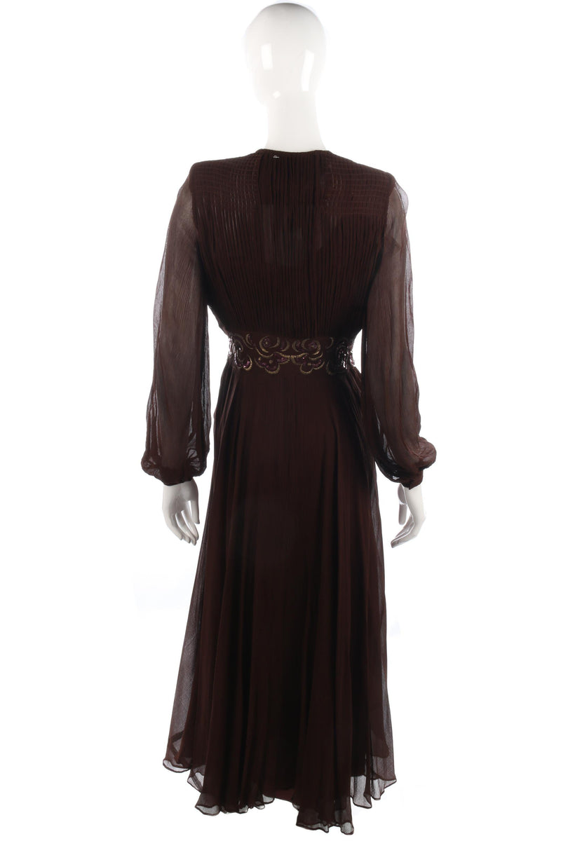 Fabulous silk chiffon vintage brown dress with sheer sleeves. A sequin and embroidered waist band with gold and pink colours.