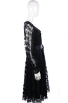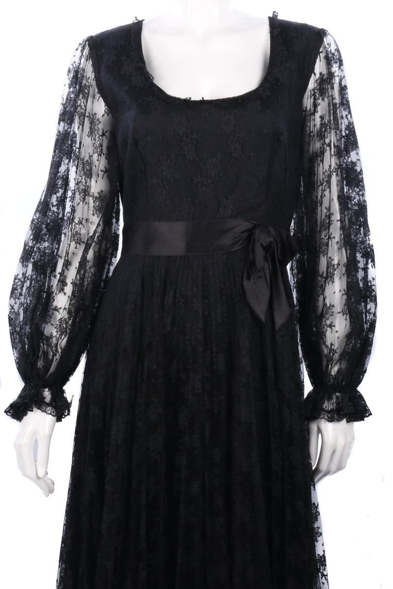 Beautiful vintage lace dress with sheer lace sleeves with a ribbon belt at the waist. Zip fastening at the back.