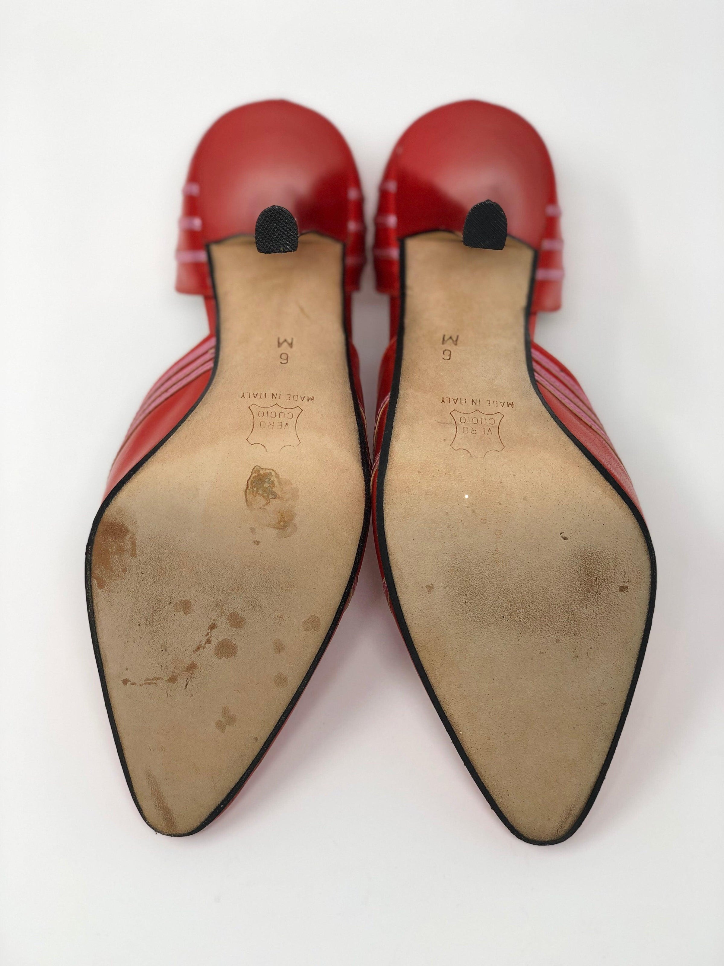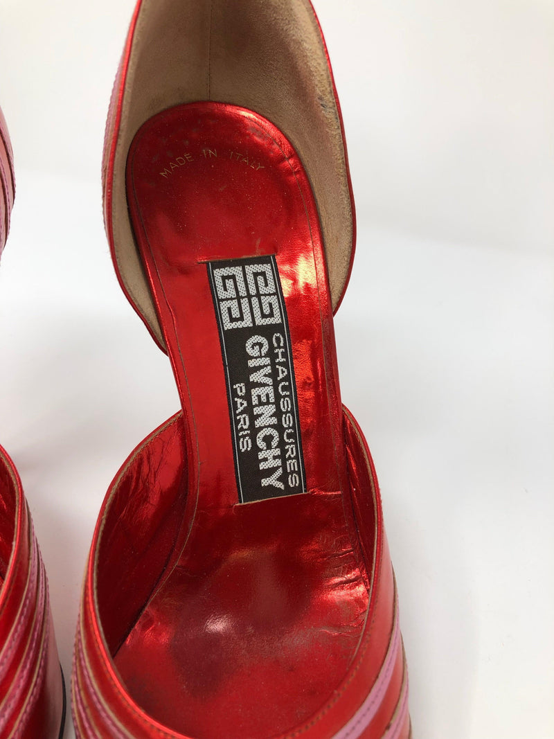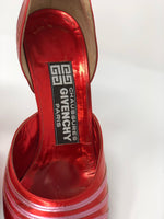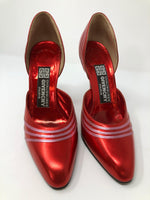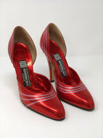Truly amazing vintage designer shoes. Made in Italy and look like they have been worn once. In fantastic condition with no scuffs on the shoes or heels. Metallic red with pink stripe design over the toes and around the heels. Heel height 4".