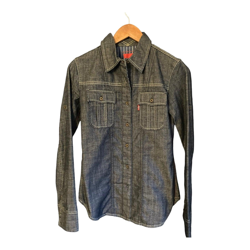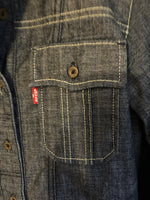 Levi Strauss Denim Long Sleeved Fitted Shirt UK Size Small. Gorgeous classic Levi fitted shirt. Details such as small logo'd buttons to front and cuffs, patch chest pockets with classic stitching and matching buttons. Sleeves can be folded back to reveal stripped material seen in the inside yolk of the shirt or rolled and secured with a tab. Measures 35 inches at the chest and 28 at the waist which is a UK size 10. Label states small. Just classic Levi, excellent condition.
