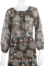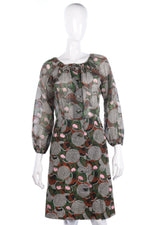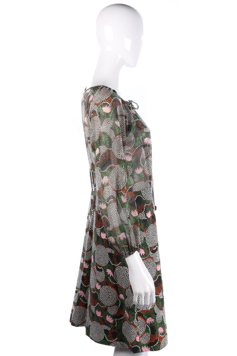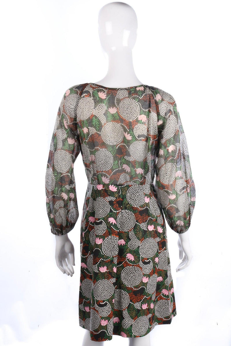 Lovely fitted dress with button fastening all down the front. The top half is not lined, so is sheer. However, skirt is lined. No size or material label. We estimate the dress to be a UK10/12