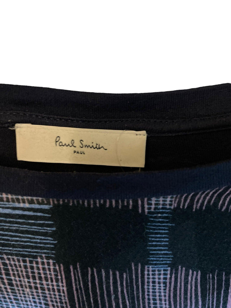 Paul Smith Fine viscose long sleeved top with a pattern to the front only. Uk Size Medium. The main colours are light pink and blue against a navy background. Excellent Condition.