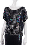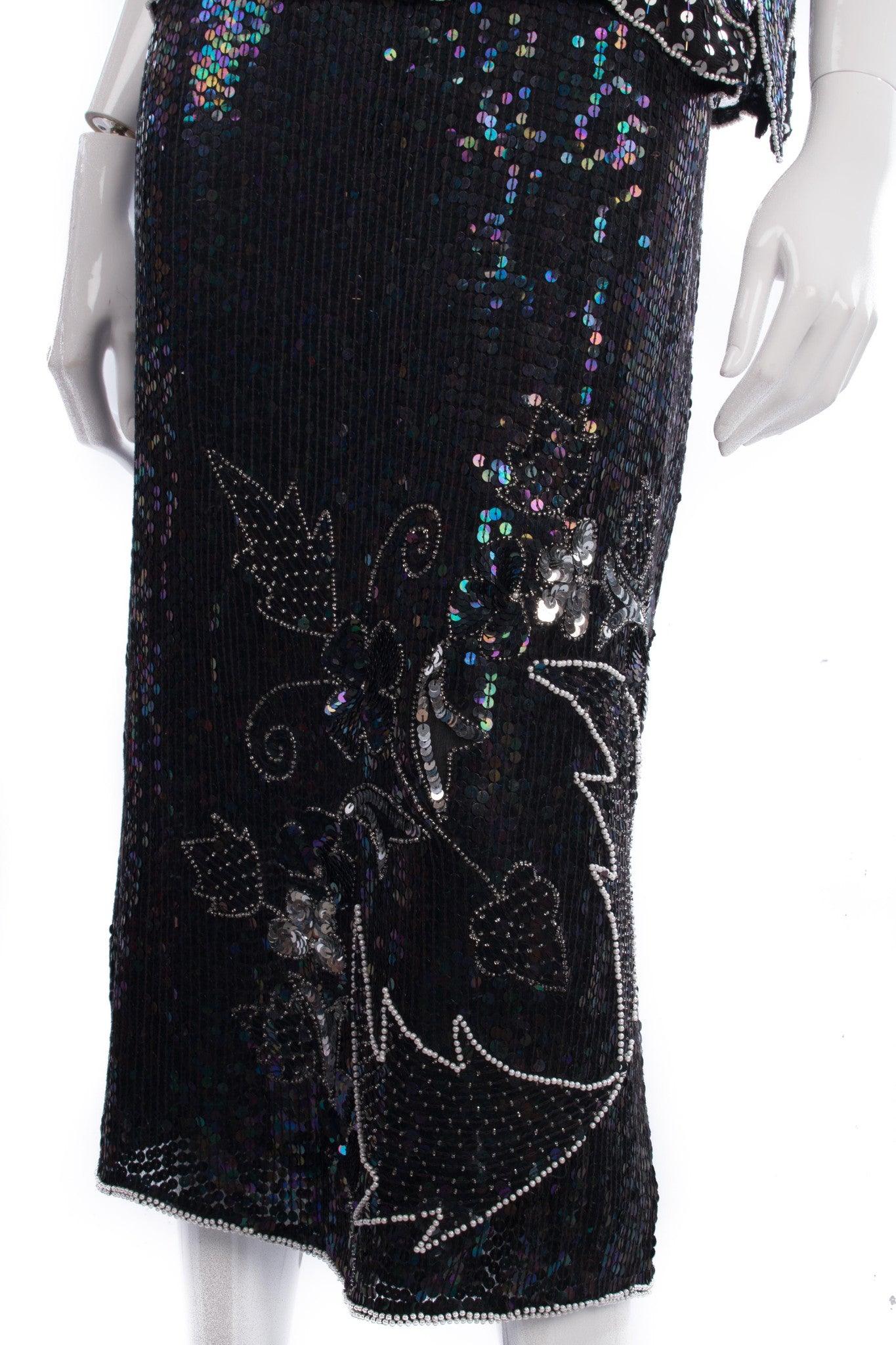 Stunning evening outfit. Loose silk top, fully sequinned with black and white sequins and beads. Elasticated waist on the skirt which is also fully beaded and sequins. Size M/L