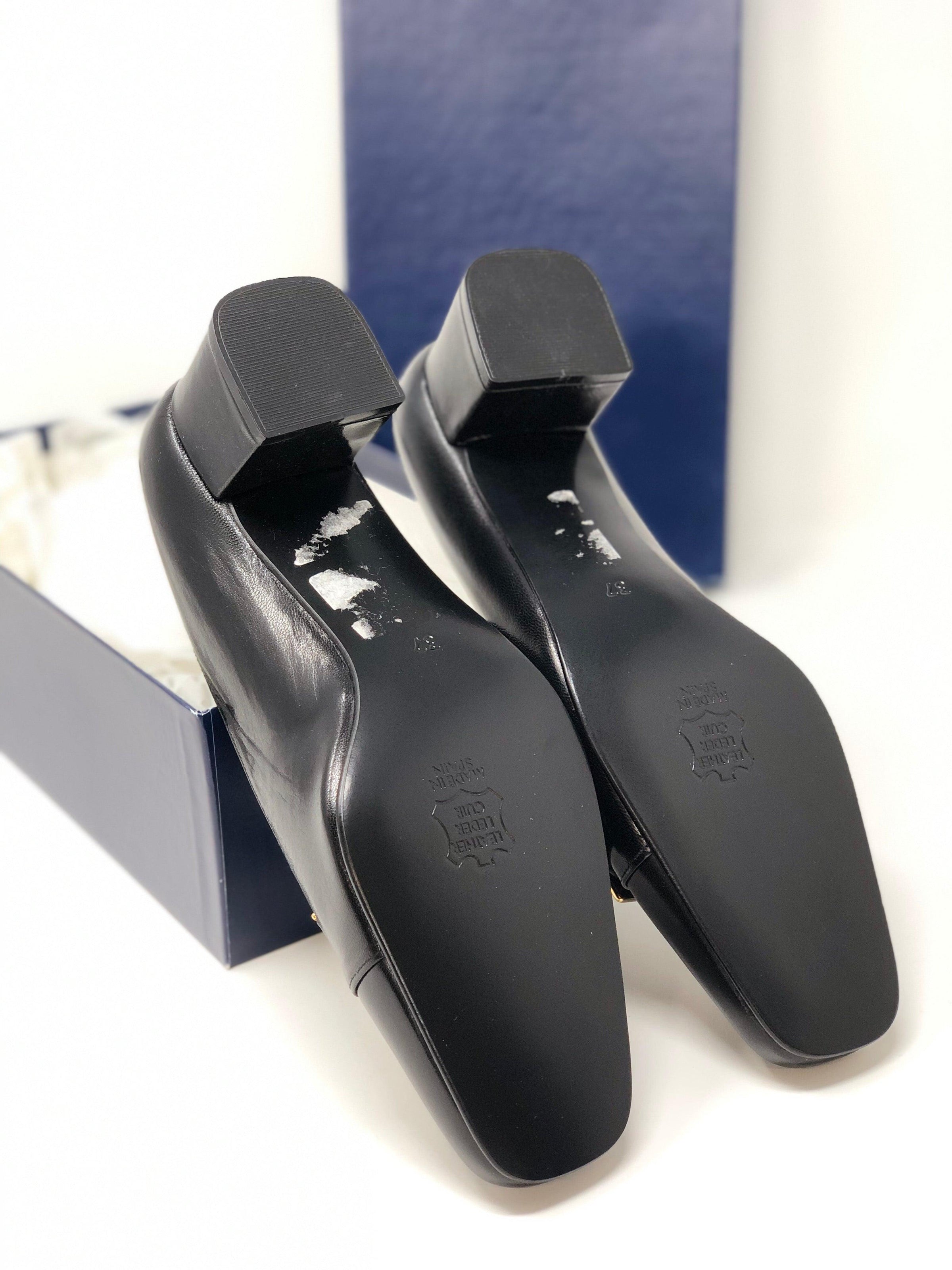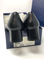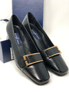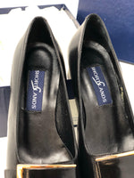 Unworn leather court shoes. Wide 2 inch high heels. Very stylish and comfortable with gold buckle on the front.  Made in Spain. Immaculate. In original box