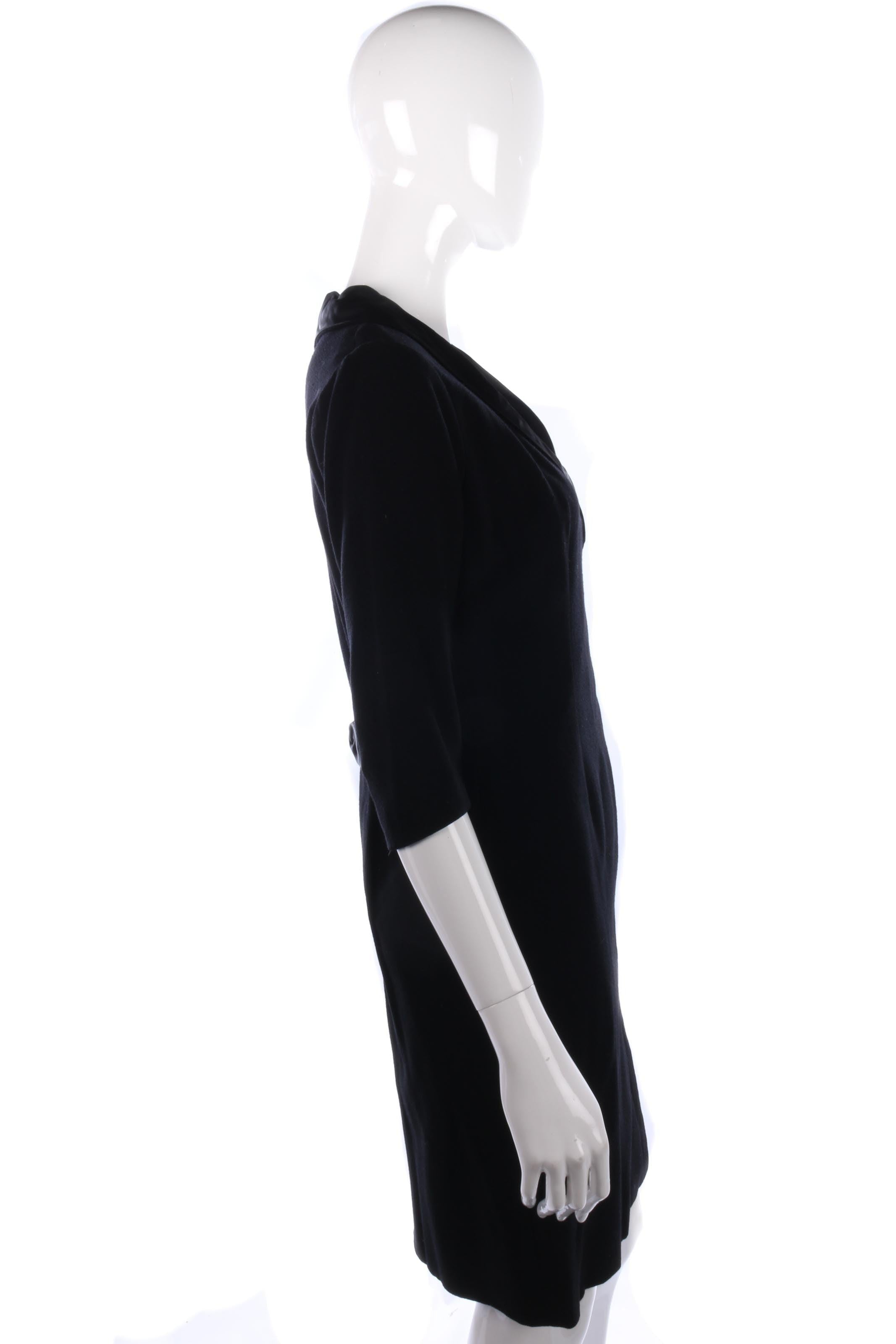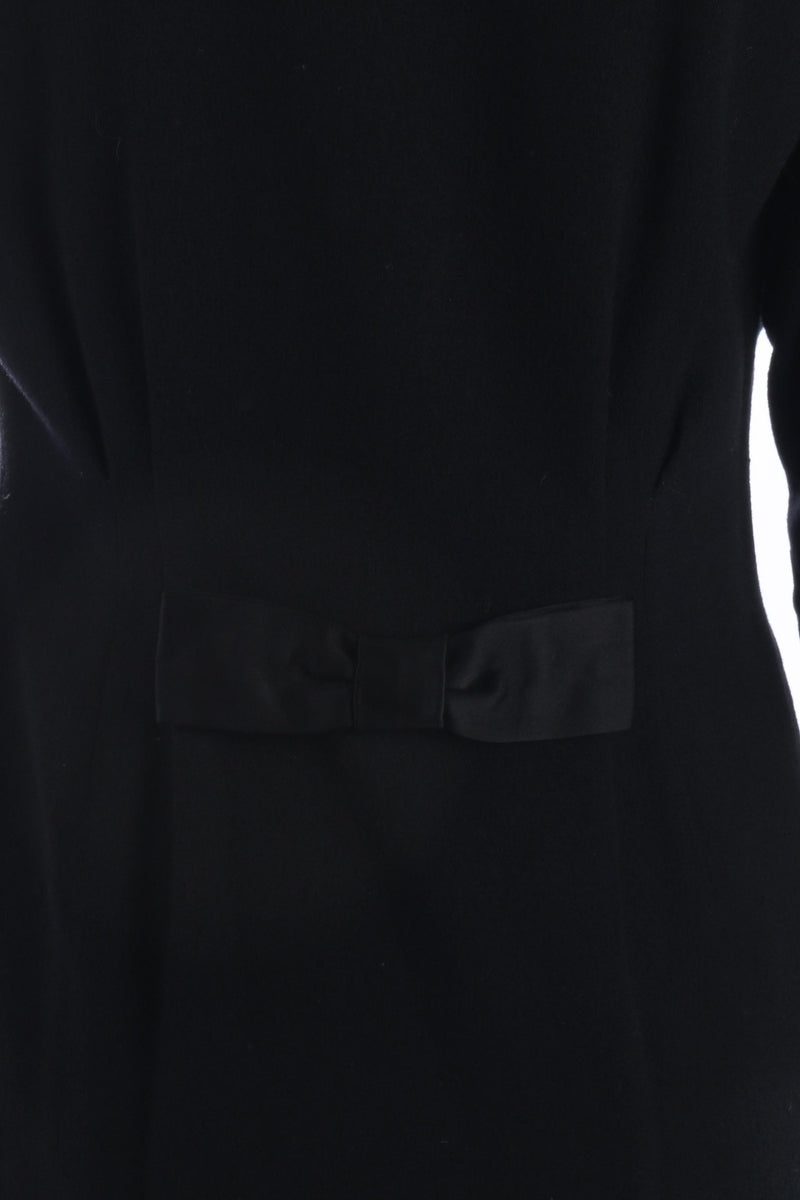 A lovely black dress, a blazer style with silk material lapels and buttons, and a bow on the back. A classic dress. buttons and hooks fasten the dress at the front. It is a wool crepe materia;l