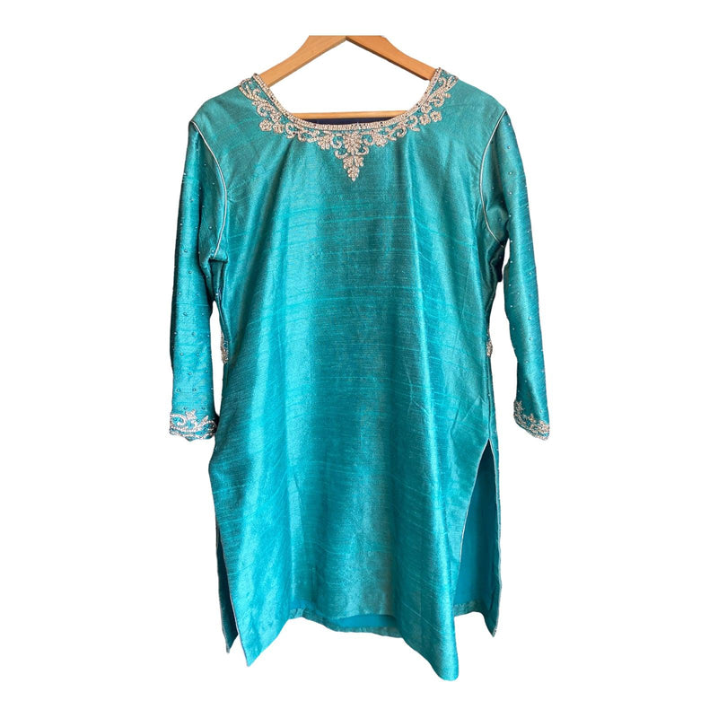 Vintage Teal Long Sleeve Tunic UK Size 18. Silver diamante and pearl patterned beading throughout garment. Side Splits, Excellent Condition.